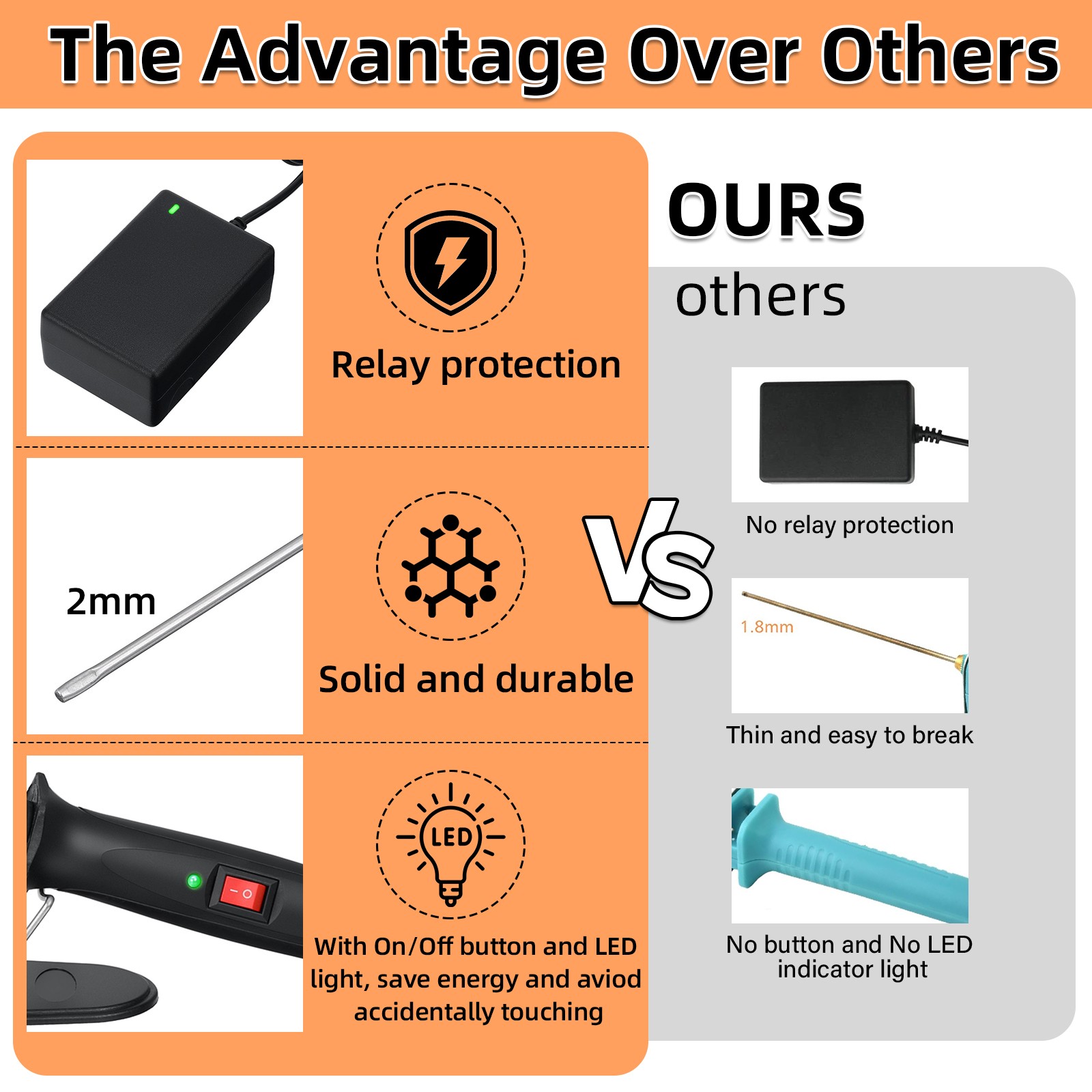 • 【ON/OFF Switch and LED Indicator】There is an On/off switch on the handle.It's very convenient to switch on and off, so you don't need to unplug it when you're not using it. LED indicatorwill Lights up while you're working, not need to worry about forgetting it's turned off or accidentally touching heating pen.(not in most foam cutters)