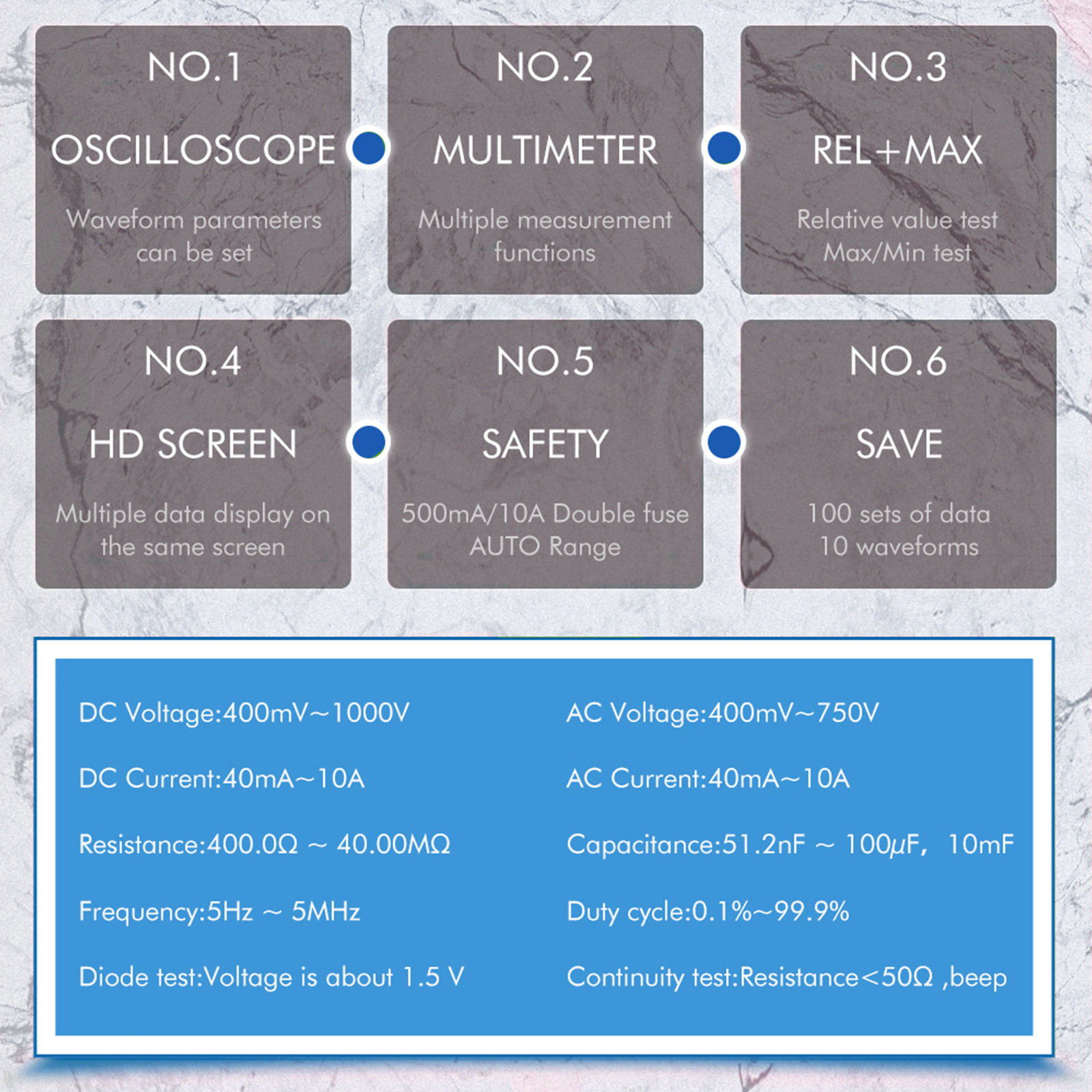 ▼Overload Protection & Multi-Purpose -Built-in 500mA/10A double protective tube,dual protection of the instrument.Automatically shutdown in case of no operations for 15 minutes,applicable to the workplace such as family,school, and factory.DISTORTION DETECTION ALSO Protect safety.