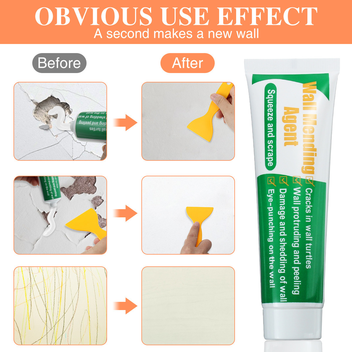 Effective Drywall Repair - White delicate scrub resistant, environmental protection and valid wet prevent, has self-adhesive, quickly & effectively repair the wall holes, graffiti and stain. Can not use for wet wall, mortar off powder wall, uncleaned damaged wall, etc. Warm Tips: You should paint the wall after using the wall mending cream.